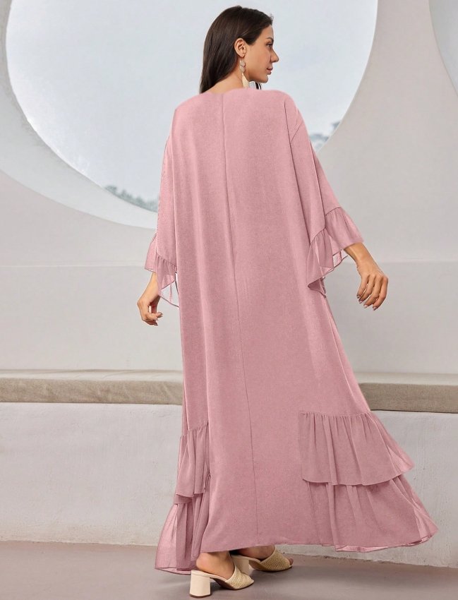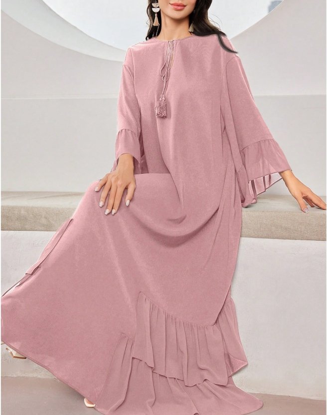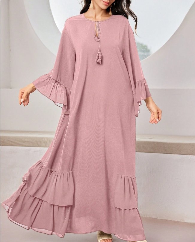 اكتشفي سحر الأناقة مع ستان عربي أنيق ذو أكمام متدلية، المصمم بعناية ليجمع بين الجمال والخفة. يأتي هذا الفستان ليُضفي عليكِ إطلالة مثالية تناسب جميع المناسبات؛ من الحفلات الراقية إلى التجمعات العائلية.