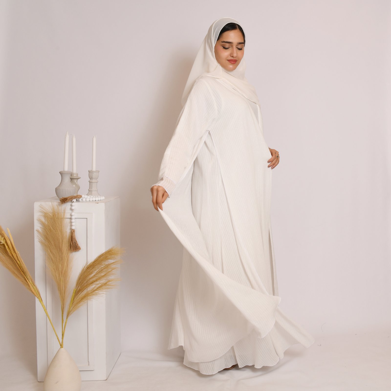 سواء كنتِ تبحثين عن قطعة مميزة لإطلالة مكتبية أنيقة أو للقاءات الاجتماعية الخاصة، عباية لف ربع كلوش باللون الأبيض تقدم لك الخيار المثالي لكل تلك اللحظات. يمكن تنسيقها مع حقائب يد وإكسسوارات بألوان مكملة لتبرز إطلالتك بشكل متوازن وجذاب. تصميم العباية يجعلها مناسبة للإطلالات النهارية والمسائية على حد سواء، ما يجعلها الحل الذكي لخزانة المرأة العصرية التي تهتم بالتفاصيل.