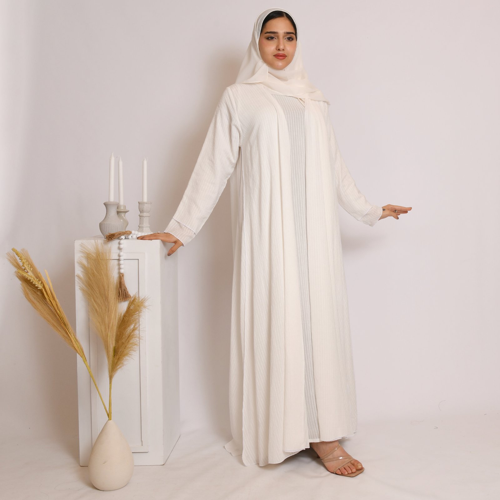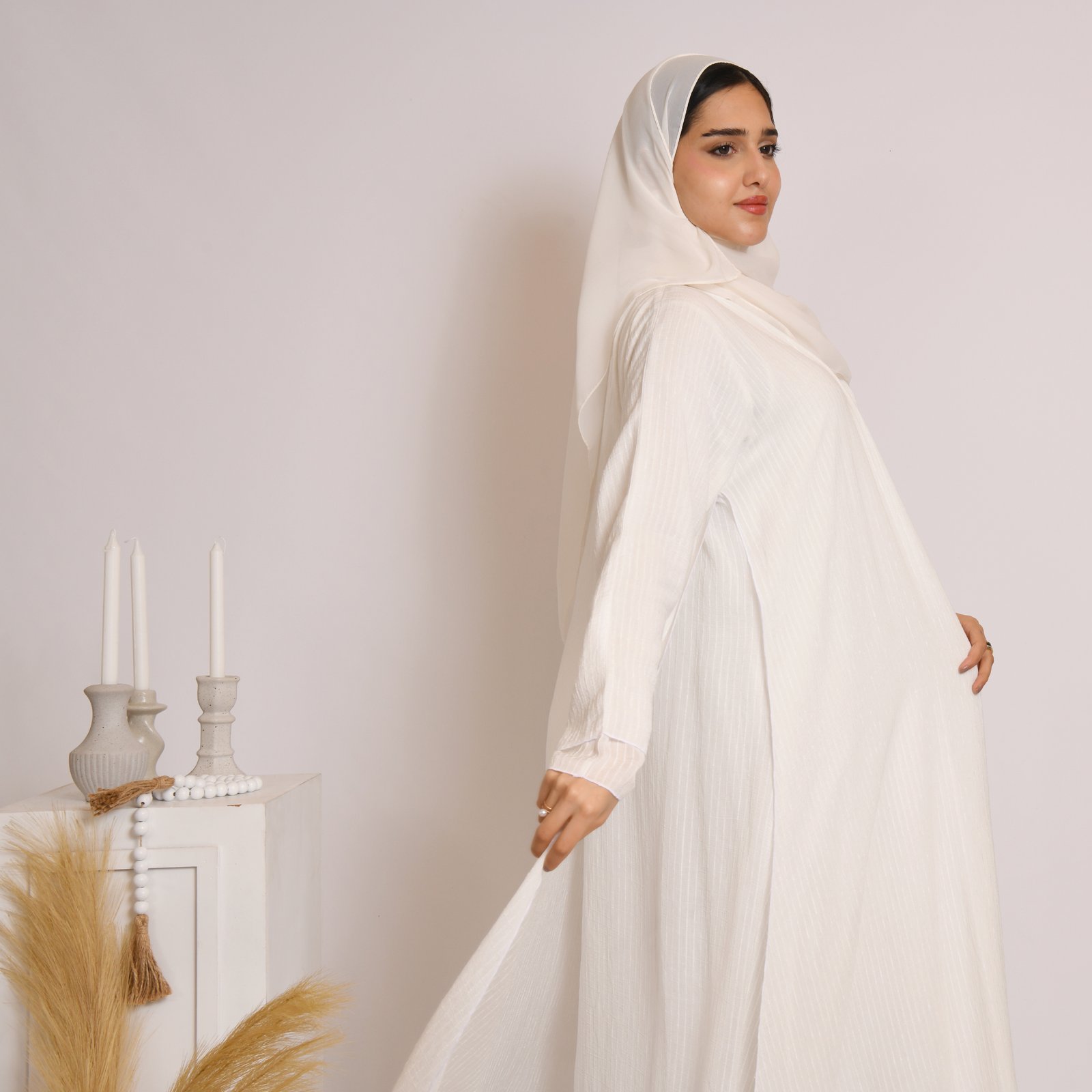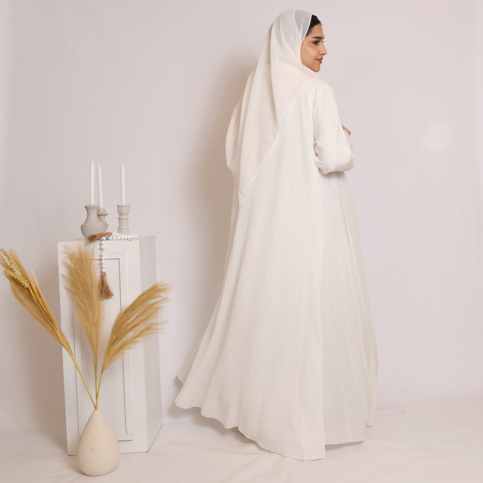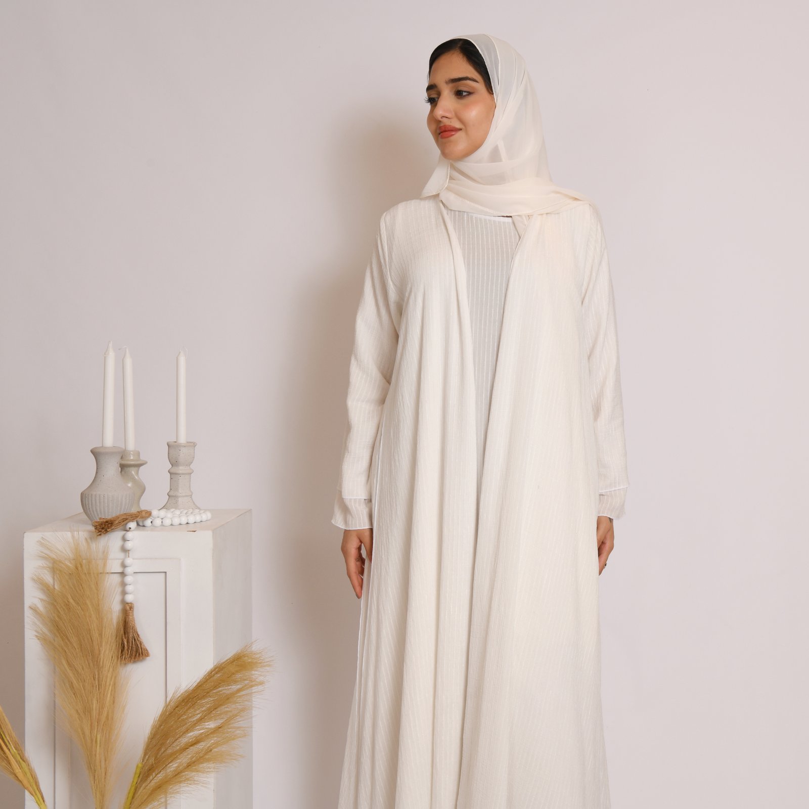 تم تصميم العباية من مواد عالية الجودة والمتينة لتضمن لك الراحة والأناقة معًا. القماش الأبيض الناصع يعزز الشعور بالفخامة ويجعل العباية سهلة الارتداء والتنظيف، مما يجعلها خيارًا مثاليًا لإضافة لمسة أنيقة إلى خزانتك. الاحتمالات لا نهاية لها حيث يمكنك تسليط الضوء على العباية من خلال الإكسسوارات المناسبة أو اعتماد إطلالة بسيطة تُبرز جمال التصميم.